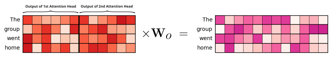 To accomplish this, the output of all attention heads in the same multi-head attention layer are first concatenated into a single tensor. Since $d_k = d_{model} / h$, the embedding vectors in these concatenated tensors have again a size of $d_{model}$. However, this tensor does not form the final output, instead this tensor is multiplied by another weight matrix $\mathbf{W}_o$. For one, this adds additional trainable parameters to the layer and therefore additional capacity for the Transformer model to learn. And also, this output weight matrix makes the multi-head attention layer more flexible in case the values of $d_q$, $d_k$, and $d_v$ are not always identical and do not derive from $d_{model} / h$ — in which case the embeddings in the concatenated tensor not necessary of size $d_{model}$ anymore. However, in the basic Transformer architecture, the output weight matrix $\mathbf{W}_o$ is defined as: