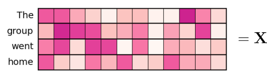 To illustrate the calculations behind attention and multi-head attention, we naturally use a much smaller embedding size. More specifically, we set $d_{model} = 12$ throughout the rest of the notebook. As such, the figure below visualizes the input embedding tensor $\mathbf{X}$ of the English sentence "The group went home" with each of the 4 words represented by a 12-dimensional word embedding vector: