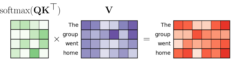 Notice here the importance of normalizing the rows in $\mathbf{Q}\mathbf{K}^\top$. Without it the values in the output vectors (red) may be of very different magnitudes compared to the value vectors (purple).
