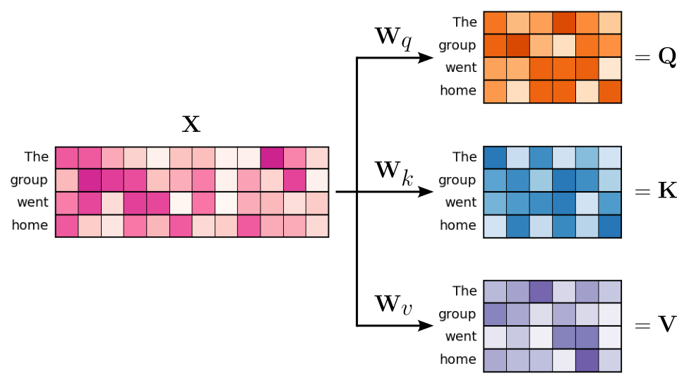 For our running example, let assume $d_q = d_k = d_v = 6$. With this, we can visualize the transformation of our tensor $\mathbf{X}$ containing the input embedding vectors into the respective query, key, and value tensors $\mathbf{Q}$, $\mathbf{K}$, and $\mathbf{V}$ as shown in the illustration below: