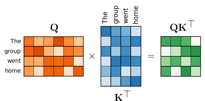 Since we are interested in the alignment between all pairs of query and key vectors, we can calculate all dot products using matrix multiplications, as the figure below illustrates: