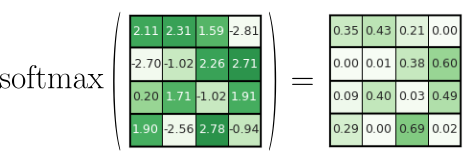 To ensure that the output vectors of the attention mechanism are of a similar magnitude, we need to normalize the (unbound) attention scores. More specifically we have to normalize $\mathbf{Q}\mathbf{K}^\top$ such that all values in a row sum up to $1$ — the reason for this will be clear in a bit. To accomplish this, we can simply apply the softmax function to $\mathbf{Q}\mathbf{K}^\top$ — to each row in $\mathbf{Q}\mathbf{K}^\top$ to be more precise. The figure below illustrates this operation using a $\mathbf{Q}\mathbf{K}^\top$ tensor with some arbitrary attention scores.