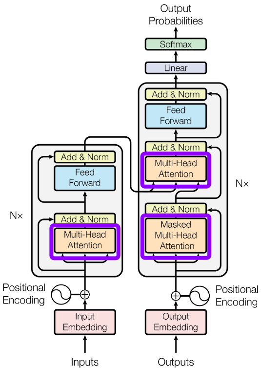 While asking is an extension to the implementation of the scaled dot-product attention, the complete Transformer architecture features more components and operations beyond the multi-head attention layers. The figures below is taken from the original Transformer paper "Attention is all you Need" shows the complete architecture with the encoder and decoder, and highlights the parts which we covered in this notebook — the multi-head attention layers.