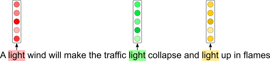 - Even with respect to a single syntactic function, the same word may have (very) different meanings. For example, a traffic light is arguably a very different thing compared to a torch light — or just the noun "light" in a sentence like "I saw the light at the end of the tunnel". Again, using the embedding vector for each occurrences of "light" would limit a model's capacity to better capture the context-dependent semantics of words.