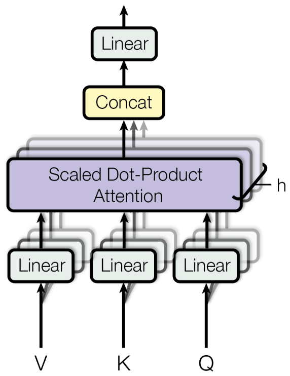 By using multiple heads, the Transformer can capture richer and more diverse contextual information than a single attention mechanism would allow. After each head computes its attention output, the results are concatenated and linearly transformed, combining insights from all heads into a unified representation. This multi-headed approach helps the model learn more nuanced representations of the input, which is especially useful in tasks like translation, summarization, or question answering, where understanding multiple layers of meaning is critical. The figure below from the Transformer paper shows the concept of multi-head attention. In this figure, $h$ represents the number of attention heads.