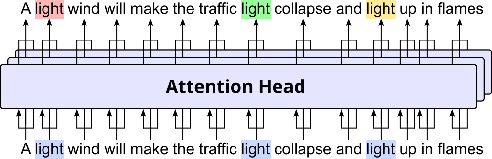 In general, an attention head aims to capture syntactic relationships (e.g., subject-verb agreement, modifiers and what they modify) and semantic relationships (e.g., coreference resolution, synonyms or paraphrases) between words. This includes that even the same pair of words may form different relationships. To capture different types of such relationships in parallel, the Transformer architecture employs more than one attention head in parallel for the same input sequence(s). All parallel attention heads are combined into a single network layer called multi-head attention. The figures below visualizes this idea combining 3 attention heads into a multi-head attention layer.