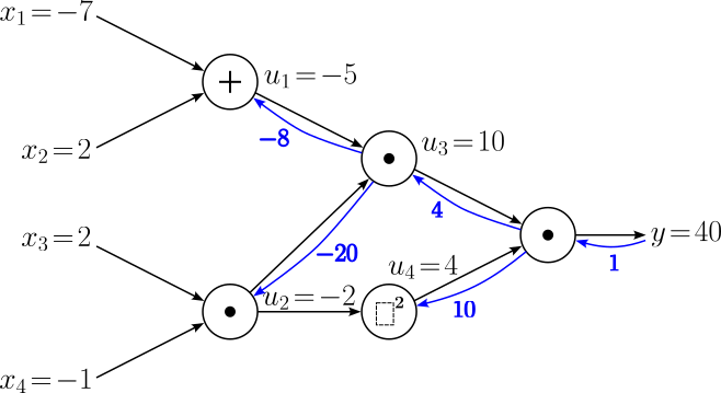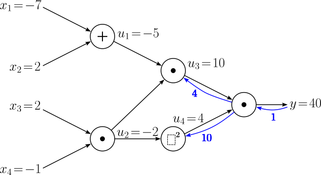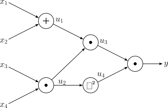 | $$\large y = u_3u_4$$ | $$\large \frac{\partial y}{\partial u_3} = u_4\ , \quad \frac{\partial y}{\partial u_4} = u_3$$ |