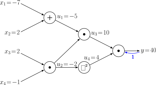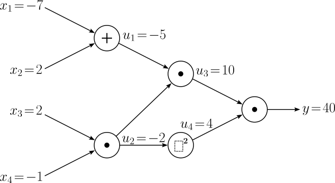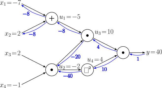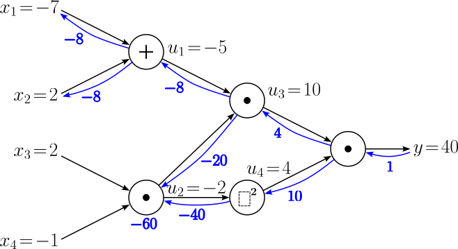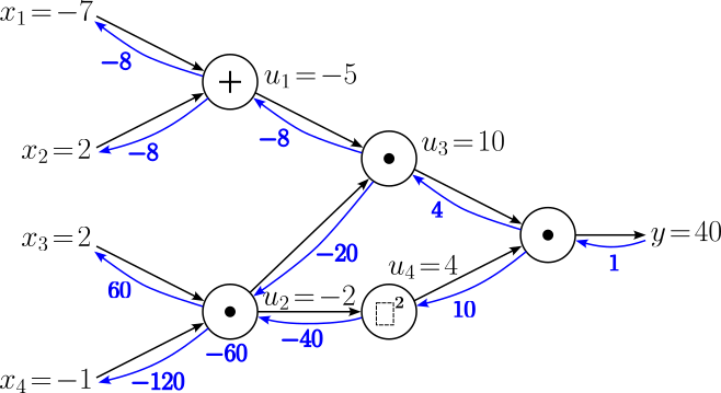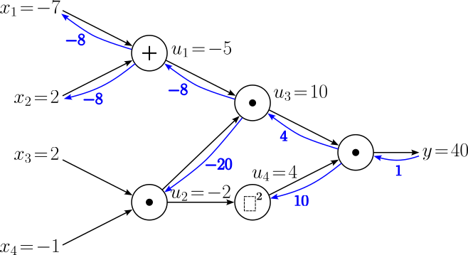 $$ \begin{align} \large \frac{\partial y}{\partial x_1} &= \large \frac{\partial y}{\partial u_1}\cdot \frac{\partial u_1}{\partial x_1} \\[0.5em] \large \frac{\partial y}{\partial x_2} &= \large \frac{\partial y}{\partial u_1}\cdot \frac{\partial u_1}{\partial x_2} \\[0.5em] \end{align} $$With $\large \frac{\partial y}{\partial u_1} = -8$ and the two local gradients we already know, $\large \frac{\partial y}{\partial x_1}$ and $\large \frac{\partial y}{\partial x_2}$ evaluate to: