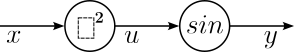 To give an example, the figure below shows the computational graph for the function $y = f(x) = sin(x^2)$ from above. The first node in the graph represents the squaring operation $u = x^2$; the second node represents the calculation $sin(u)$.