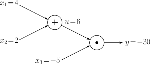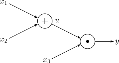 $$\large y = f(x_1, x_2, x_3) = (x_1 + x_2)x_3 $$We can define the addition and multiplication operations as their own functions: $u = x_1 + x_2$ and $y = ux_3$. Considering these two operations as nodes, the corresponding computational graph looks as follows: