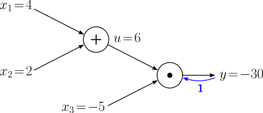 $$ \begin{align} \large \frac{\partial y}{\partial u} &= \large \frac{\partial y}{\partial y}\cdot \frac{\partial y}{\partial x_3} \\[0.5em] \large \frac{\partial y}{\partial x_3} &= \large \frac{\partial y}{\partial y}\cdot u \\[0.5em] \end{align} $$Again, having $\large \frac{\partial y}{\partial y}$ seems not really required. However, notice that we calculate both gradients by multiplying the gradient coming in from the output of the computational node — which we calculated in the previous step — and the local gradient of the corresponding input node. Furthermore, we also know the local gradients, either because it is an input variable (here $x_3$) or an intermediate result we calculated during the forward pass (here $u$). In other words, while we could calculate $u = x_1 + x+2$ again, it is much more efficient to save the result during the forward pass and re-use it for the backward pass. Plugging all values gives us the following gradients: