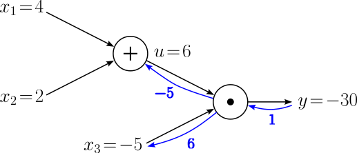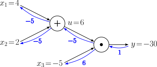 $$ \begin{align} \large \frac{\partial y}{\partial u} &= \large \frac{\partial y}{\partial y}\cdot \frac{\partial y}{\partial u} = 1\cdot x_3 = -5 \\[0.5em] \large \frac{\partial y}{\partial x_3} &= \large \frac{\partial y}{\partial y}\cdot u = 1\cdot 6 = 6\\[0.5em] \end{align} $$Let's add these gradients to our computational graph.