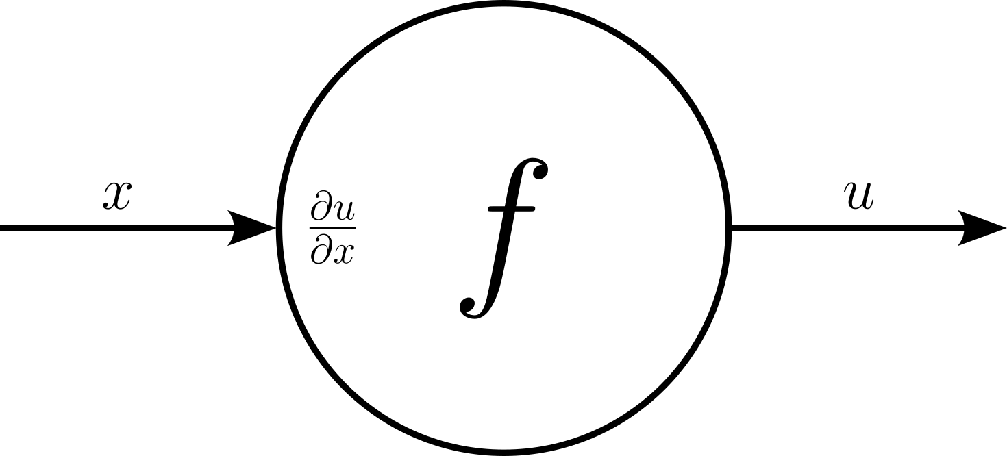 Throughout this notebook, we only consider a single computational node. However, this node can be part of an arbitrarily large computational graph. This node implements some function $f$ to calculate the output $u$ given some input $x$; more specifically:
