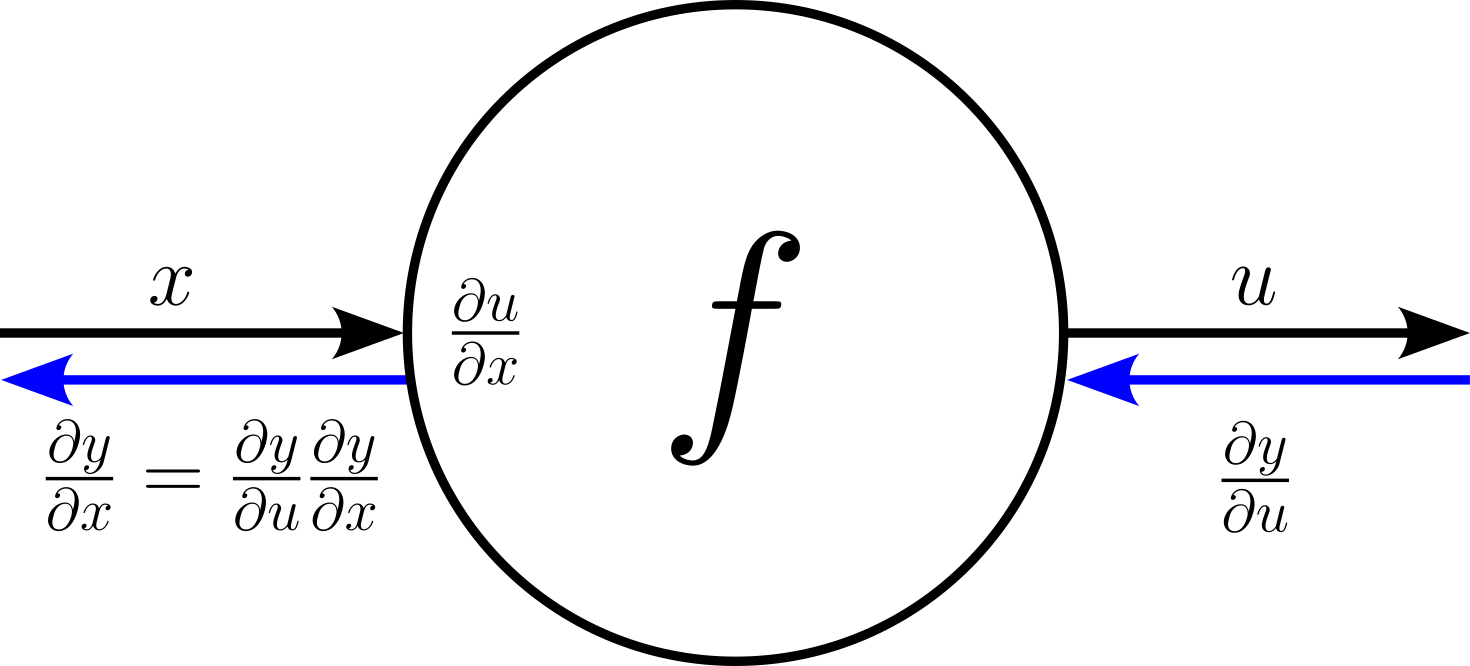 $$\large \large \frac{\partial y}{\partial x} = \frac{\partial y}{\partial u} \frac{\partial u}{\partial x} $$$\large \frac{\partial u}{\partial x}$ is commonly referred to as the downstream gradient. Visualized in our computational node: