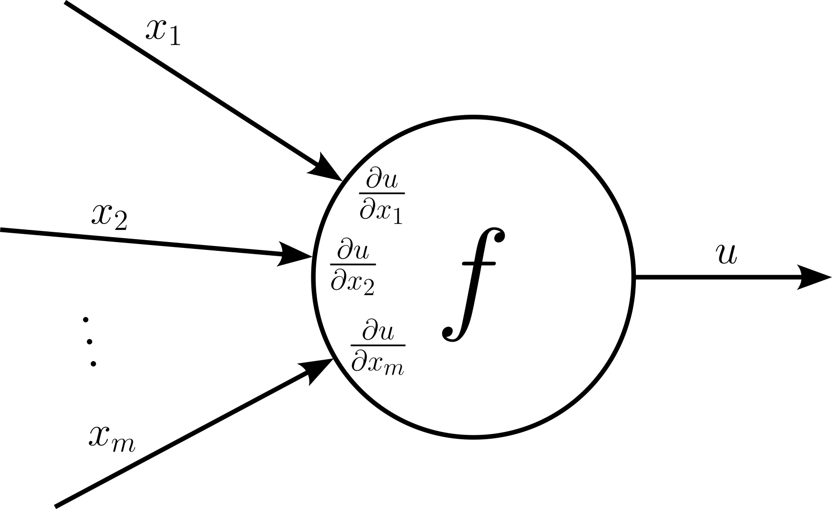 Each input $x_i$ maps to its own local gradient $\large \frac{\partial u}{\partial x_i}$. Otherwise, both the forward and the backward pass work exactly the same as for nodes with a single input. For one, this means that during the forward pass we can calculate the values for all local gradients $\large \frac{\partial u}{\partial x_i}$. During the backward pass, the node receives the upstream gradient $\large \frac{\partial y}{\partial y}$ which in turn allows to compute all downstream gradients $\large \frac{\partial x}{\partial x_i}$ as: