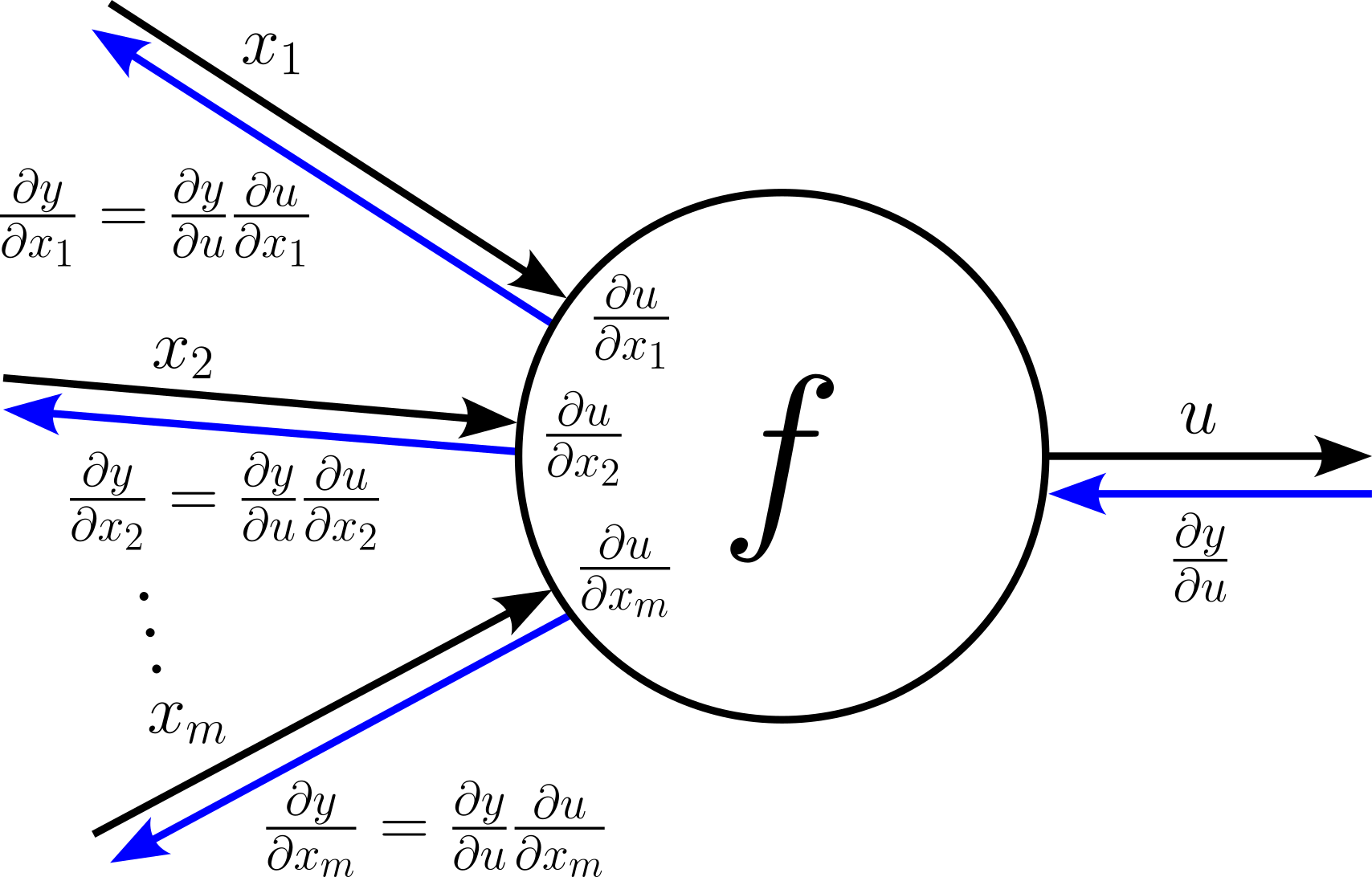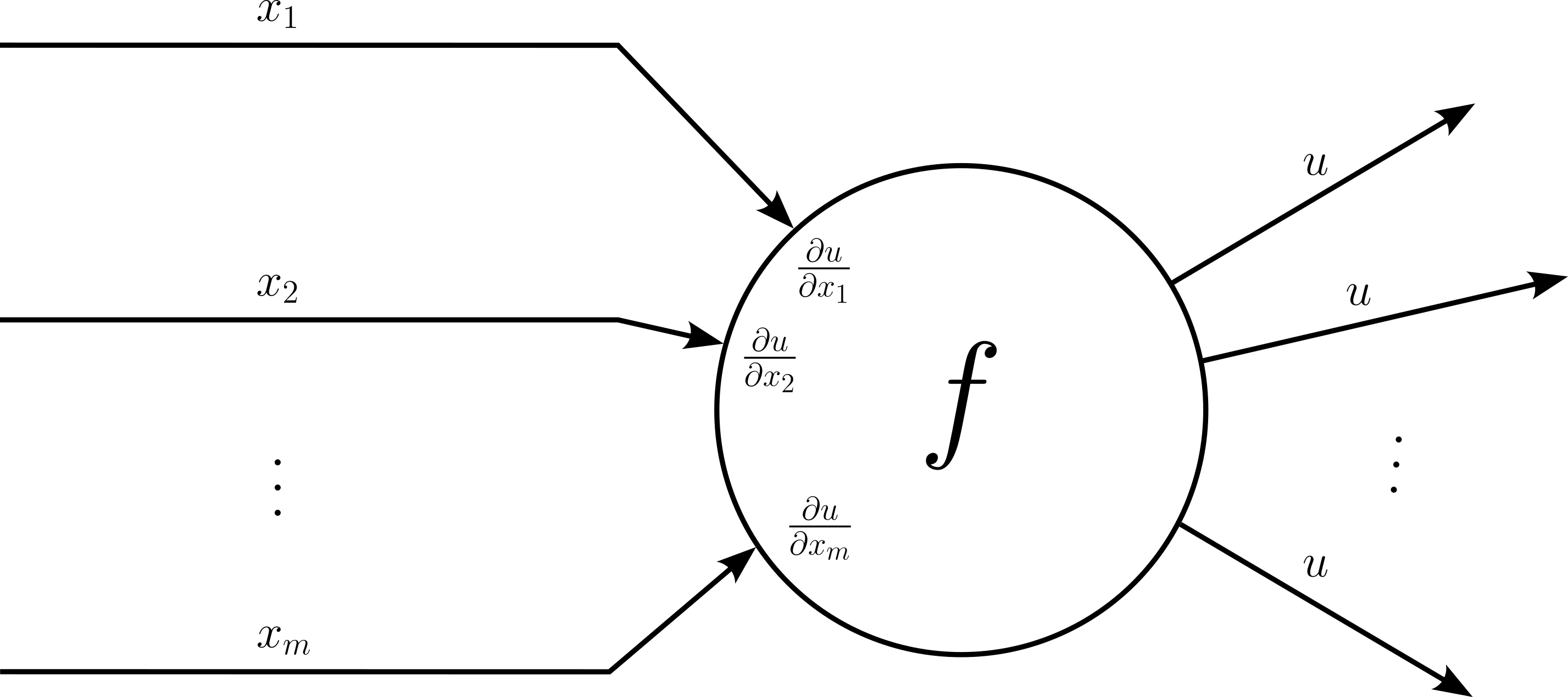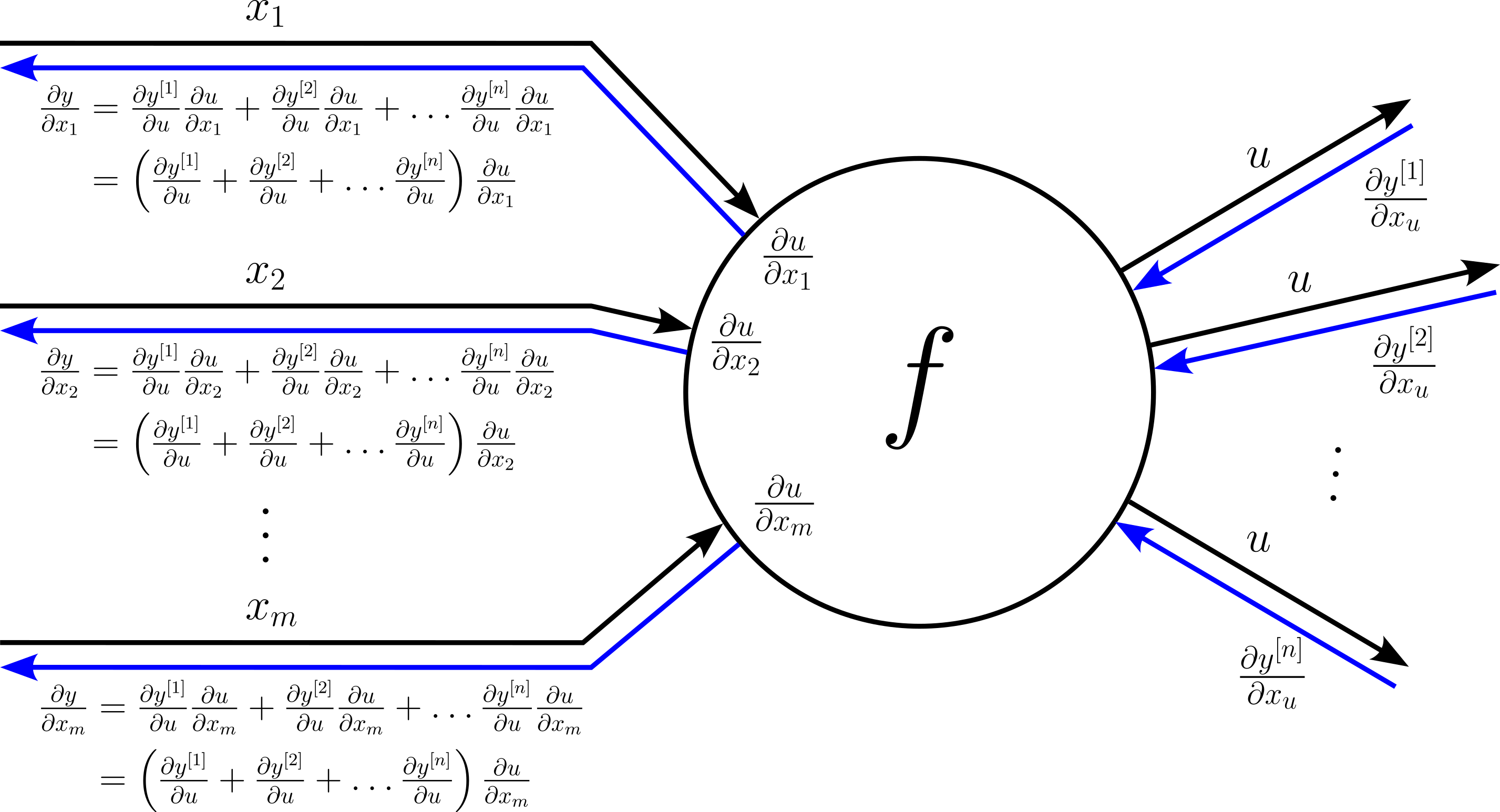 $$ \begin{align} \large \frac{\partial y}{\partial x_i} &= \large \frac{\partial y^{[1]}}{\partial u} \frac{\partial u}{\partial x_i} + \frac{\partial y^{[2]}}{\partial u} \frac{\partial u}{\partial x_i} + \dots \frac{\partial y^{[n]}}{\partial u} \frac{\partial u}{\partial x_i}\\[0.5em] &= \large \left( \frac{\partial y^{[1]}}{\partial u} + \frac{\partial y^{[2]}}{\partial u} + \dots \frac{\partial y^{[n]}}{\partial u} \right) \frac{\partial u}{\partial x_i} \end{align} $$Again, let's complete our picture of a computational node accordingly.