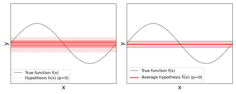 The bias quantifies how close our hypothesis (i.e., our model) $h(x)$ to the unknown true function $f(x)$, averaged across many dataset sampled based on $y = f(x) + \epsilon$, giving has many hypothesis $h_D(x)$. To this end, we calculate the bias as difference between the expected prediction over different training datasets and the true value given $f(x)$: