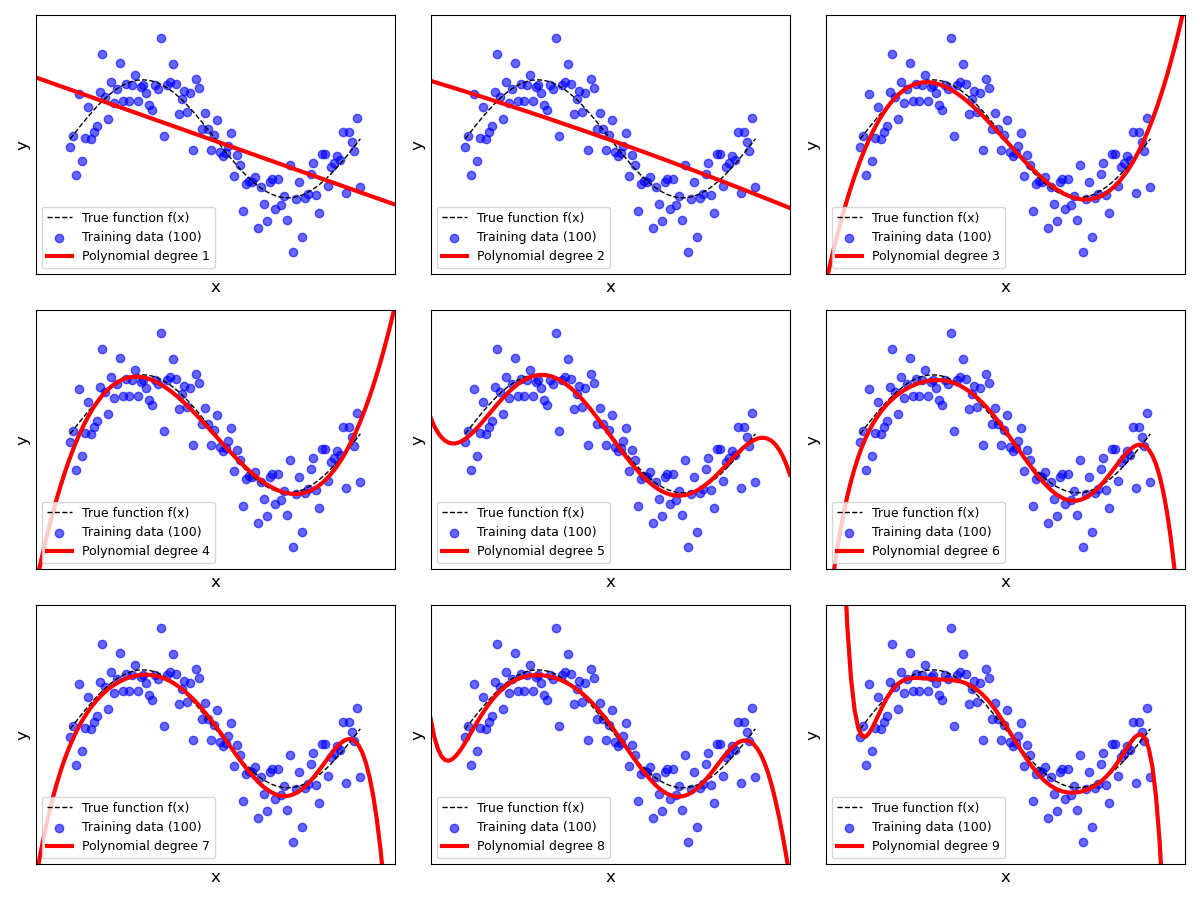 In fact, if you observe the plots for $p=9$ or check for yourself using poly_degree = 9 and n_points_subset = 10 using the previous code cell, you can see that the regression line perfectly fits all data samples. In other words, the training error would be $0$. However, the corresponding fitted lines show extreme trends that do not reflect the true relationship between the inputs and the outputs at all. Again, the problem is that each data sample contains noise and the model has sufficient capacity to fit those noisy samples. Of course, it should be obvious that this model is likely to perform very poorly. Even for unseen data samples — due to the extreme trends — the model will often make very wrong predictions.