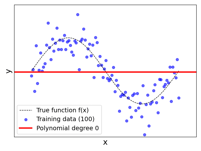 Small polynomial degrees underperform: Unsurprisingly, for $p=0..2$, our hypothesis $h(x)$ does a poor job estimating the true function $f(x)$. The reason is that for small polynomial degrees, our regression model makes simplifying assumptions about the underlying relationship between the input features and the output. For example, for $p=1$ the model assumes that the true relationship is linear (constant for $p=0$, quadratic for $p=2$) which clearly is not true. It's like having a preconceived notion or a strong "opinion" about how things should work, even before looking closely at all the data, which is often not difficult or impossible in practice. These simplifying assumptions inherently introduce an error called the bias or model bias (since this term has different meanings depending on the context). We also often say that our model has insufficient capacity to properly fit the data. The bias is a systematic error since the model makes predictions that are consistently off in a particular and understandable way. It generally also cannot be reduced by simply adding more training data or repeated training. In simple terms, you can think of bias as the model being wrong in the same way every time.