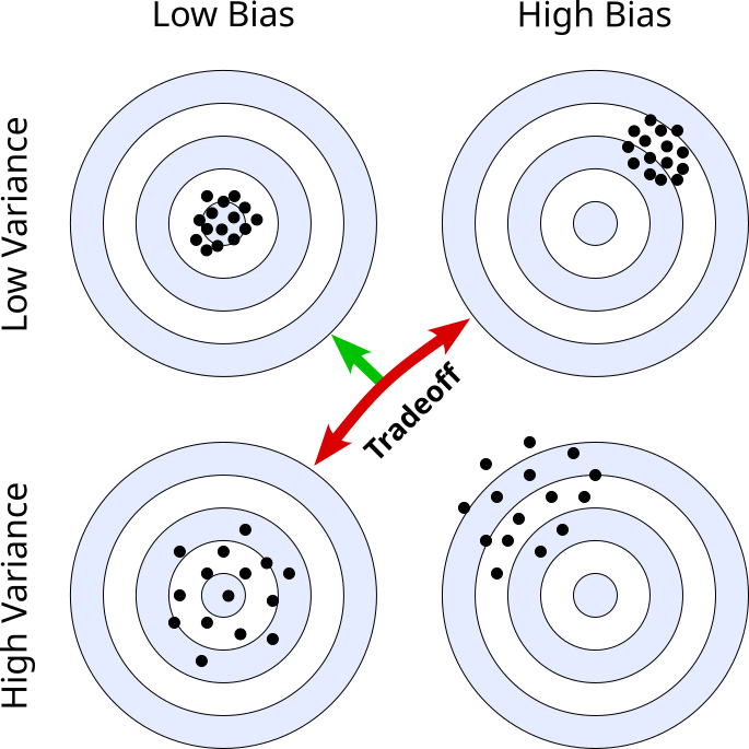 High bias, low variance (top right): Here, all darts only have a small spread (low variance), but they hit an area systematically outside the center of the target (high bias). This means our model is not sensitive to changes in the training data, but the predictions are almost always quite wrong, indicating underfitting due to insufficient model complexity.