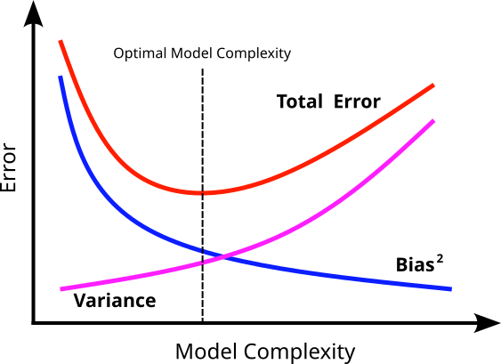 Insight into the bias-variance tradeoff: The decomposition highlights that there is typically an inverse relationship between bias and variance. Simple models (e.g., Linear Regression on complex non-linear data) tend to have high bias (underfitting) and low variance (they are not very sensitive to changes in training data). In contrast, complex models (e.g., deep neural networks with many parameters) tend to have low bias (can fit complex patterns) but high variance (overfitting to training data, highly sensitive to data fluctuations). The goal is to find a model complexity that achieves a good balance between bias and variance, minimizing the total generalization error.
