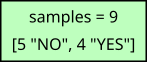 Since we do not test any condition that would lead to any branching, our single root node is a leaf node. In principle, we could stop here and use this "tree" to make predictions. In case a leaf node contains samples from multiple classes, the majority class is commonly used as the prediction. In other words, we would always predict "NO" for any training or test sample, independent from its feature values. This is arguably not a very useful model. To make more meaningful predictions that take the features of samples into account, we need to start splitting nodes.