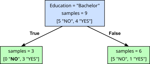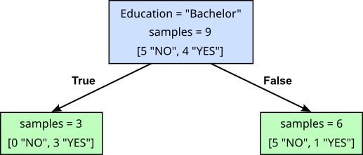 Our root node has now become an internal node as it contains a test on a feature resulting in two branches ending in two new leaf nodes. In our small dataset, there are customers with a "Bachelor" degree. For these three customers, the split condition is true. Thus, the corresponding three data samples move to the left child node (the "True" branch); all remaining six samples (with a "Masters" or "PhD" degree) move to the right child node (the "False" branch).