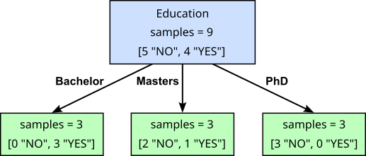 The ID3 algorithm is primarily designed for categorical data; features with (continuous) numerical features need to be discretized (e.g., converting the dollar values of Annual_Income to "low", "mid", and "high"). ID3 splits nodes by creating a new branch and child node for each possible value for the selected features. For example, ID3 would split a node using Education into three child nodes for "Bachelor", "Masters", and "PhD"; see below: