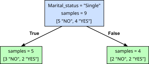 We saw that both root split yield Decision Trees mapping the samples from the training data to their respective class labels with respect to the samples' feature values. So the question is: Which split do we consider the preferred choice? The rationale of all Decision Trees is that they prefer splits that result in a better separation of the data samples according to their classes. Before the split, we start with a leaf node with a fairly mixed set of class labels (5 "NO" and 4 "YES"). Splitting this node based on condition if the Marital_Status of a customer is "Single", we end up with to child nodes where the class labels are still very much mixed (3 "NO" and 2 "YES" in the left child node; 2 "NO" and 2 "YES" in the right child node). In simple terms, we didn't really make much progress.