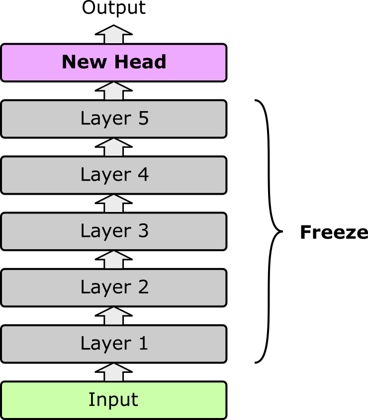 Feature extraction is one of the simplest ways to leverage a pretrained model for a new task. In this approach, the pretrained model is kept frozen, and its role is to act purely as a fixed feature extractor. Input data is passed through the model, and the output representations (often embeddings from the last hidden layer) are used as features. On top of these fixed features, a new trainable head — such as a linear classifier, multilayer perceptron, or other lightweight module — is added and trained on the target dataset. Since only the head's parameters are updated, training is computationally cheap and avoids altering the pretrained weights. The figure below shows the idea (assuming the same simple 5-layer pretrained model we saw for full and partial fine-tuning).