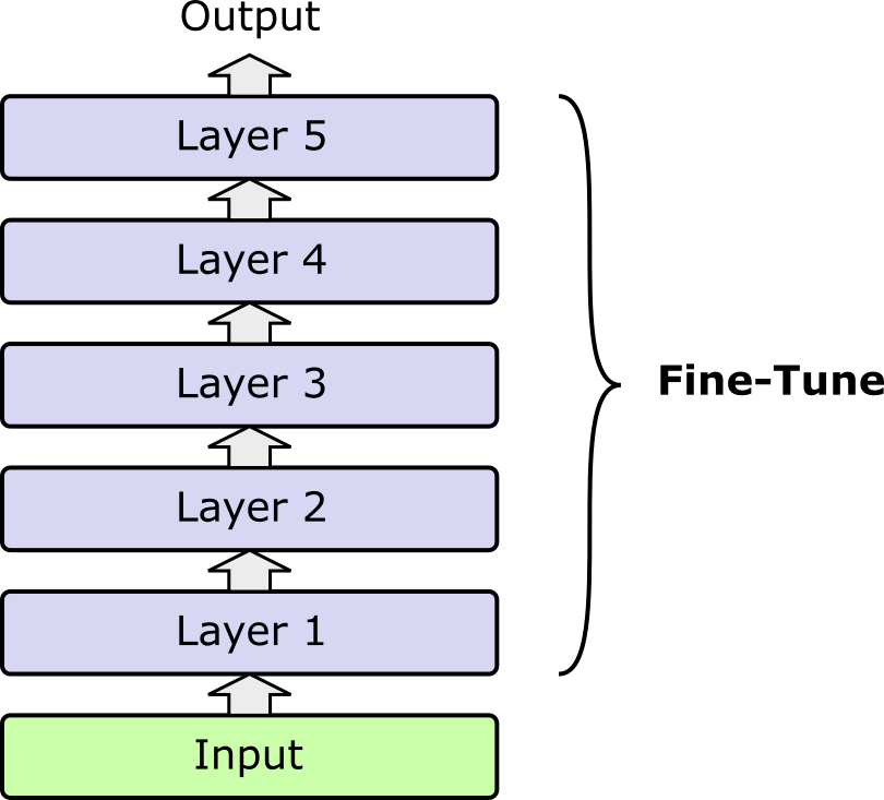 Full fine-tuning means taking a pretrained model — such as a large language model trained on massive amounts of general text — and updating all of its parameters on a new dataset so that it adapts fully to a specific task or domain. The following figure illustrates this idea by assuming a network with five layers (e.g., 5 transformer layers in a transformer encoder or decoder), where all the weights in all the layers get updated during fine-tuning.
