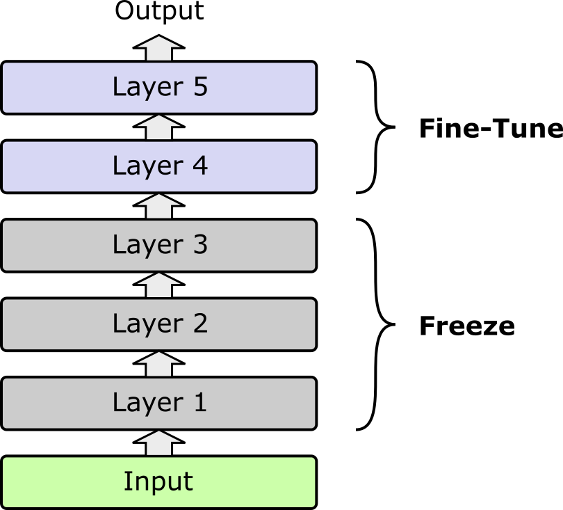 Partial or selective fine-tuning is an intermediate approach between full fine-tuning and parameter-efficient methods. Instead of updating all the parameters of a pretrained model, only a subset — typically the last few layers — are fine-tuned on the target task, while the earlier layers remain frozen. The rationale is that early layers usually capture general features (e.g., edges in images, syntactic patterns in text) that are broadly useful across tasks, whereas later layers encode more task-specific representations. By updating only the later layers, the model can adapt to new tasks without losing the general knowledge captured during pretraining; the figure below illustrates this idea.