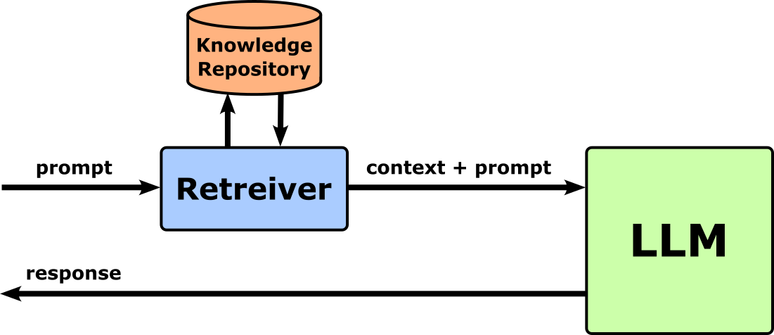 Retrieval-augmented generation (RAG) is an approach that enhances pretrained language models by combining them with an external knowledge retrieval system. Instead of relying solely on the model's internal parameters — which are limited to what it learned during pretraining and its knowledge cutoff — RAG dynamically retrieves relevant documents or passages from a large knowledge base when generating responses. The model then conditions its output not just on the user’s query, but also on the retrieved context. This helps the model produce more accurate, up-to-date, and grounded answers without needing to retrain or fine-tune the entire network. The figure below shows the most basic RAG setup. The retreiver receives the initial prompt and fetches relevant documents from the knowledge repository. This context together with the initial prompt is then passed to the LLM to generate the response.