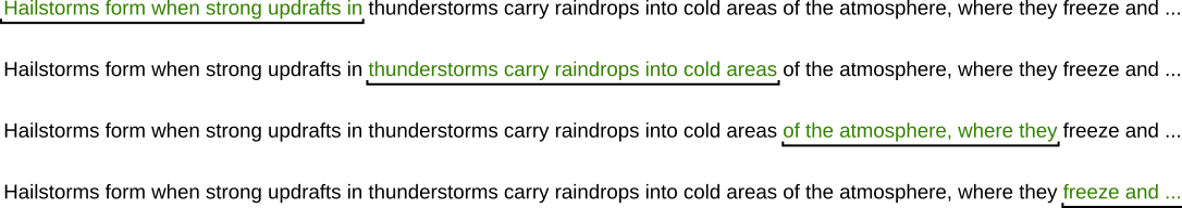 In practice, our training data may consist of many such document streams so that each stream can fit into memory. However, this does not affect the underlying idea of the sliding window approach; performance consideration and optimization strategies (including parallel training across large compute clusters) are beyond the scope of this notebook.