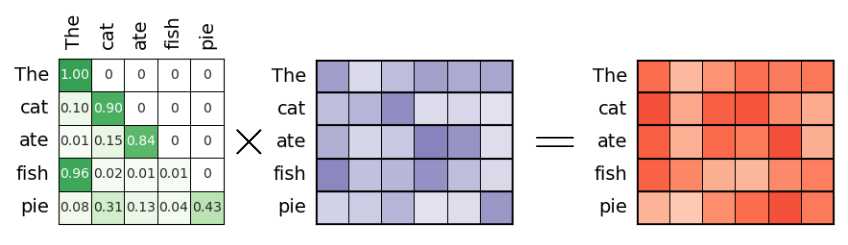 And the last step to get the final output of the attention mechanism is to multiply the attention weights $A^{(1)}_{scores}$ with the word embedding vectors in the value space represented by $V$. Given the figure below, it is easy to see that the output vector of, say, the word "ate" derives from the weights sum of the value vectors for "The", "cat", and "ate" itself — which was of course the whole purpose of applying the cause mask to the attention scores.