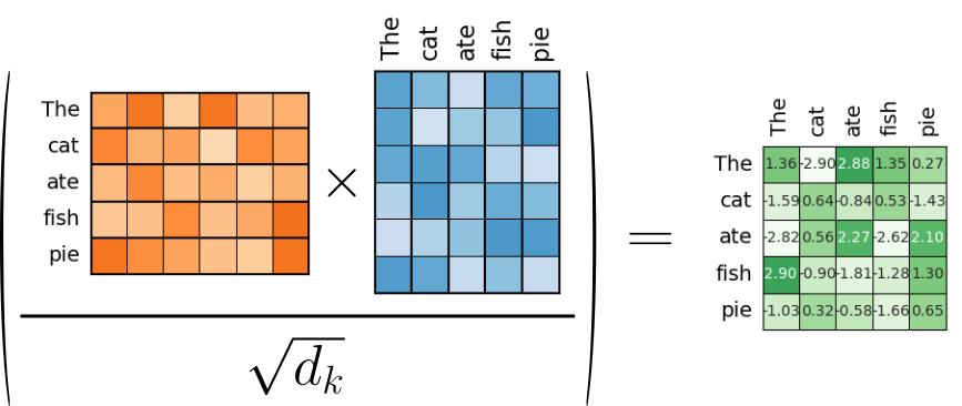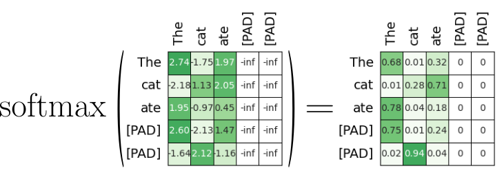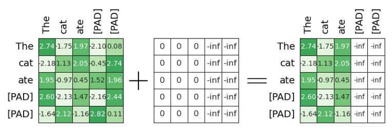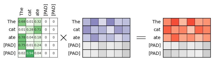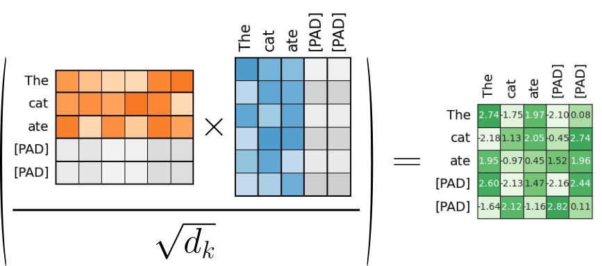 where $Q$, $K$, and $V$ contain word embedding vectors projected into the query, key, and value space. Since the padding token is also represented by some embedding vector, this vector also gets projected before the attention calculation. The figure below, shows the calculation of the attention scores $QK^T/d_k$ for the first sentence in the batch ("The cat ate [PAD] [PAD]"). The embedding vectors representing the padding token "[PAD]" are greyed out to indicate that these vectors do not carry any useful semantics. The resulting values of the attention score are just arbitrary for this purpose of this example.