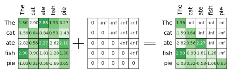 During training, however, the decoder receives the complete sequence. And as for padding, without any considerations, the attention mechanism would compute all pairwise attention scores. This means that the output of the decoder at position $t$ would depend on all previous words as well as all subsequent words. In simple terms, during training, the decoder would be able to "look into the future". This we have to ensure that each word only attends to previous words but not to subsequent words. We can accomplish this once more through masking, more commonly called causal masking because the mask enforces a cause-and-effect relationship in the sequence: each token can only "see" (i.e., attend to) previous tokens, not future ones. This preserves the causal structure necessary for autoregressive generation, where each output depends only on what has come before — not what comes after.