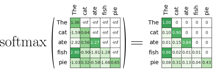 $A^{(1)}_{scores}$ contains now all pairwise attention scores including the one between a word and all its subsequent words. We now have to ensure that each word $w_q$ in $Q$ ("orange matrix") only attends to words in $K$ ("blue matrix") that come before $w_q$ in the sequence. For example, if $w_q = \text{\textit{"}}ate\text{\textit{"}}$ we only want this word to attend to "The", "cat", and "ate" itself. Extending this restriction to all words in $Q$, what we need is therefore mask $A_{causal}$ that looks as follows: