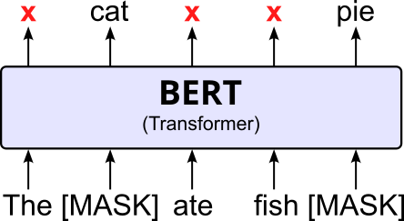 The figure below shows the basic learning setup using BERT with the Masked Language Model objective with respect to the first sentence "the [MASK] ate fish [MASK]", where the task is to predict the missing words "cat" and "pie".