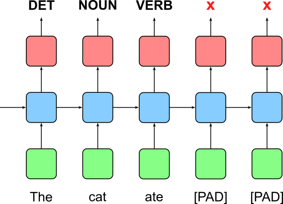Of course, we now have to consider that the padding tokens do not carry any useful meaning themselves. As such, we have to ensure that during model training, these padding tokens are ignored. For example, assume we want to train RNN-based classifier to predict of a given sentence talks about topics such as "FOOD", "BEHAVIOR", "GROOMING", "HEALTH", etc. If we give this RNN our padded example batch, it will iterate over all five words, including the padding tokens if present. The figure below illustrates the idea for the first sentence "the cate ate".