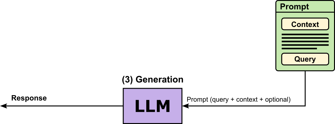 Now that we have the final prompt, all that is remaining is to pass this prompt to the LLM to generate the response; see figure below. In general, the quality of the response depends on both the accuracy of the model and the prompt. However, we typically can only affect the prompt. And since the quality of the prompt mainly depends on the quality of the retrieved content, it becomes obvious how important the creation of the knowledge base as well as the retrieval step of the RAG pipeline are.