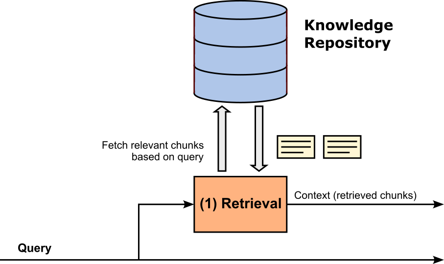 The retrieval step is the actual step that involves the knowledge repository; see the figure below. Each query is passed to the retriever which in turn uses this query to fetch the most relevant chunks, either using full-text search, vector search, or a hybrid approach, depending on the exact implementation of the knowledge base.