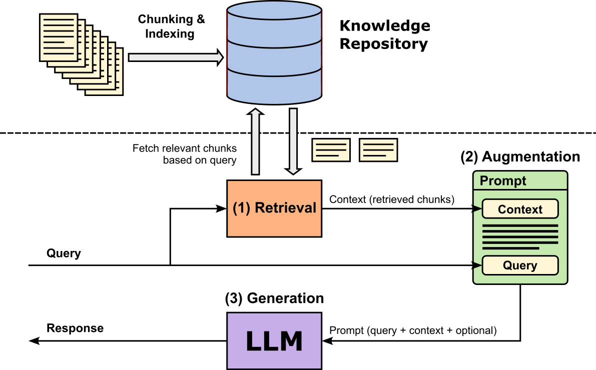 Equally important is the retrieval step, which determines which pieces of information (known as "chunks") are selected from the repository and provided to the LLM. The retrieval quality directly affects the usefulness of the generated response. Two main strategies dominate this step: full-text search and vector search. Full-text search relies on keyword-based matching, using structures like inverted indexes to efficiently locate documents containing specific terms. Vector search, on the other hand, uses dense embeddings to capture semantic similarity, allowing it to retrieve relevant passages even when the wording differs significantly from the query. Many practical RAG implementations adopt hybrid retrieval, combining both strategies to leverage the precision of keyword matching and the flexibility of semantic search.
