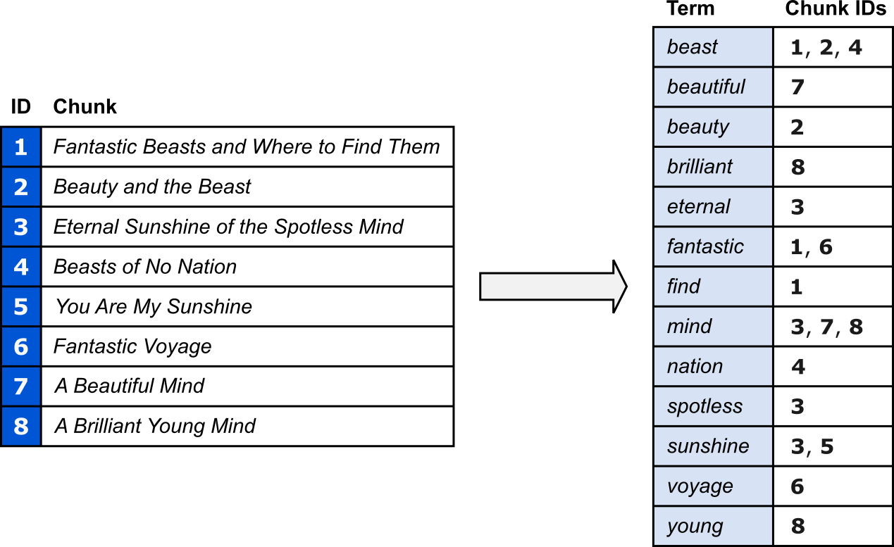Full-text search is a technique for searching a single chunk or a collection of chunks by examining every word of the text to find the most relevant results for a query. For example, given a query such as "What is the height of Mount Everest?", chunks are considered most relevant if they contain the terms "height", "Mount", "Everest" — or even the phrase "Mount Everest". The most common index to support full-text search is the inverted index. It works by mapping each unique term (typically ngrams or words) in a collection of documents (or chunk) to a list of all the documents where that token appears. By precomputing these word-to-document mappings, the inverted index allows users to quickly locate and rank documents that match a query, without scanning every text file.